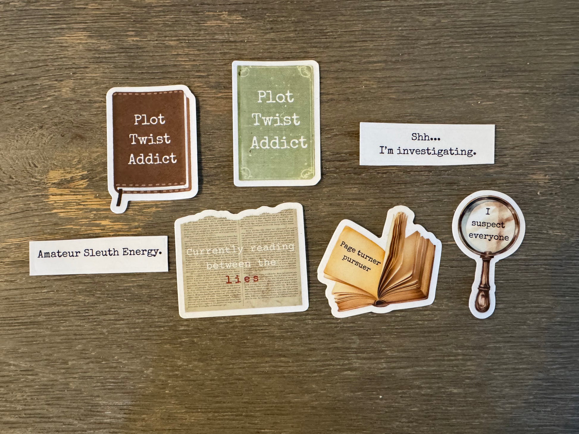 Seven mystery-themed stickers (including āPlot Twist Addictā and āI Suspect Everyoneā)