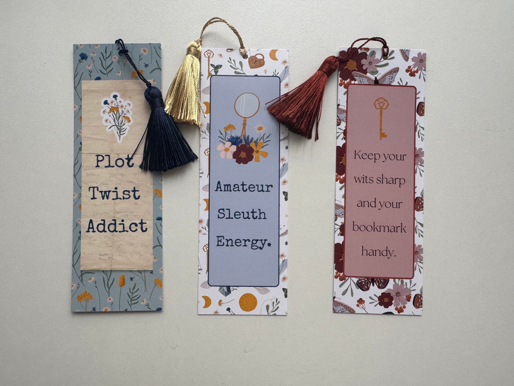 Three exclusive tassled bookmarks, including Amateur Sleuth Energy
